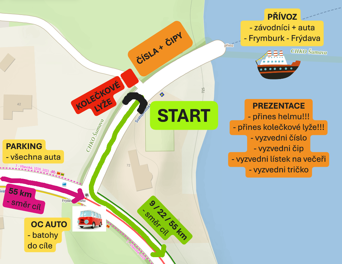 Přívoz na start: Frymburk - Frýdava 8:00, 8:30-9:45 kyvadlově dle vytížení, cesta zpět Frýdava - Frymburk pojede přívoz takto: 11:05, 12:05, 13:05, 14:05, 15:05, 16:05 - poslední jízda!