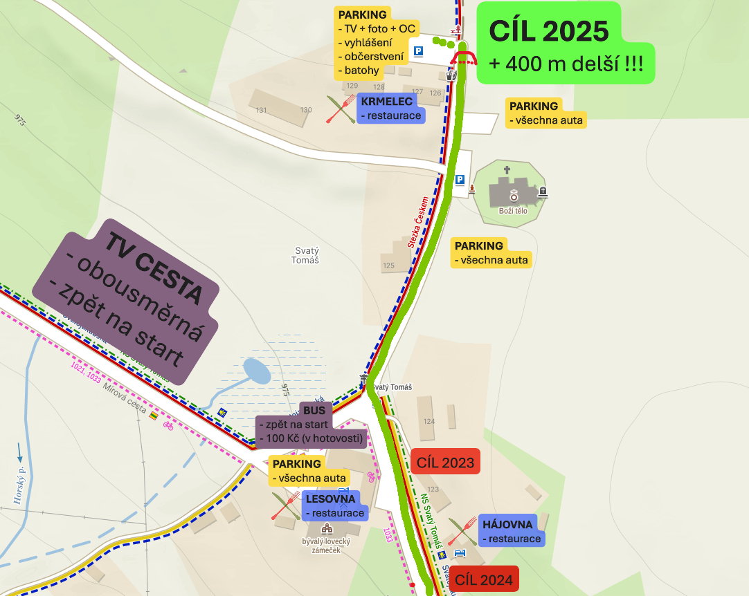 Zázemí: parkování aut v cíli ve Svatém Tomáši je možné na 2 parkovacích plochách v prostoru nad cílem závodu u kostela s omezenou kapacitou cca 50 aut. Při dopravě autem do cíle a zpět je nutno dbát dopravního značení a nijak nenarušit průběh závodu a bezpečnost závodníků na trati.